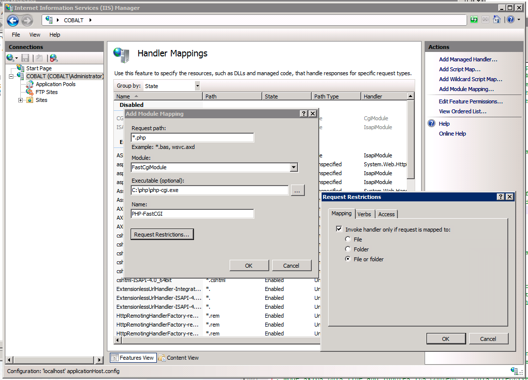 The next logical step is to setup IIS 7 so that it can properly handle *.php files and execute the CGI handler. For the first step, following the tutorial, you should setup the Handler Mappings for PHP in the following manner: